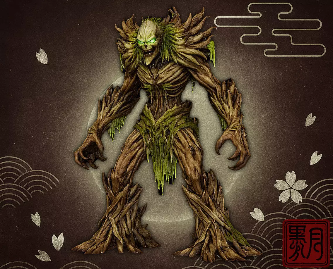 A humanoid revenant composed of gnarled roots, bark plates, and decayed wood forms.