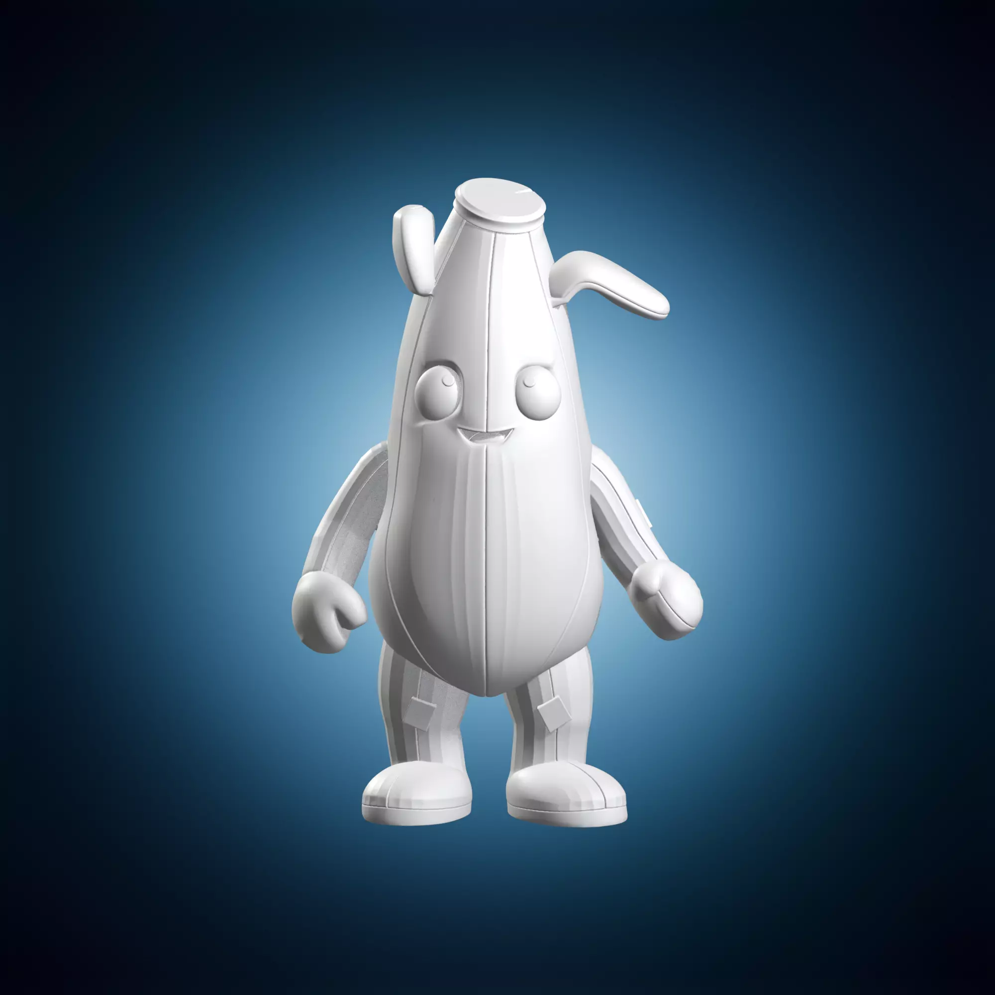 A detailed digital model of Peely from Fortnite in a bone banana costume. The model features intricate details and textures, making it suitable for use in animation, gaming, or architectural visualization. It is created using 3D modeling software and can be used as a standalone object or integrated into larger scenes. Suitable for use in various projects, including video games, films, and virtual reality applications.