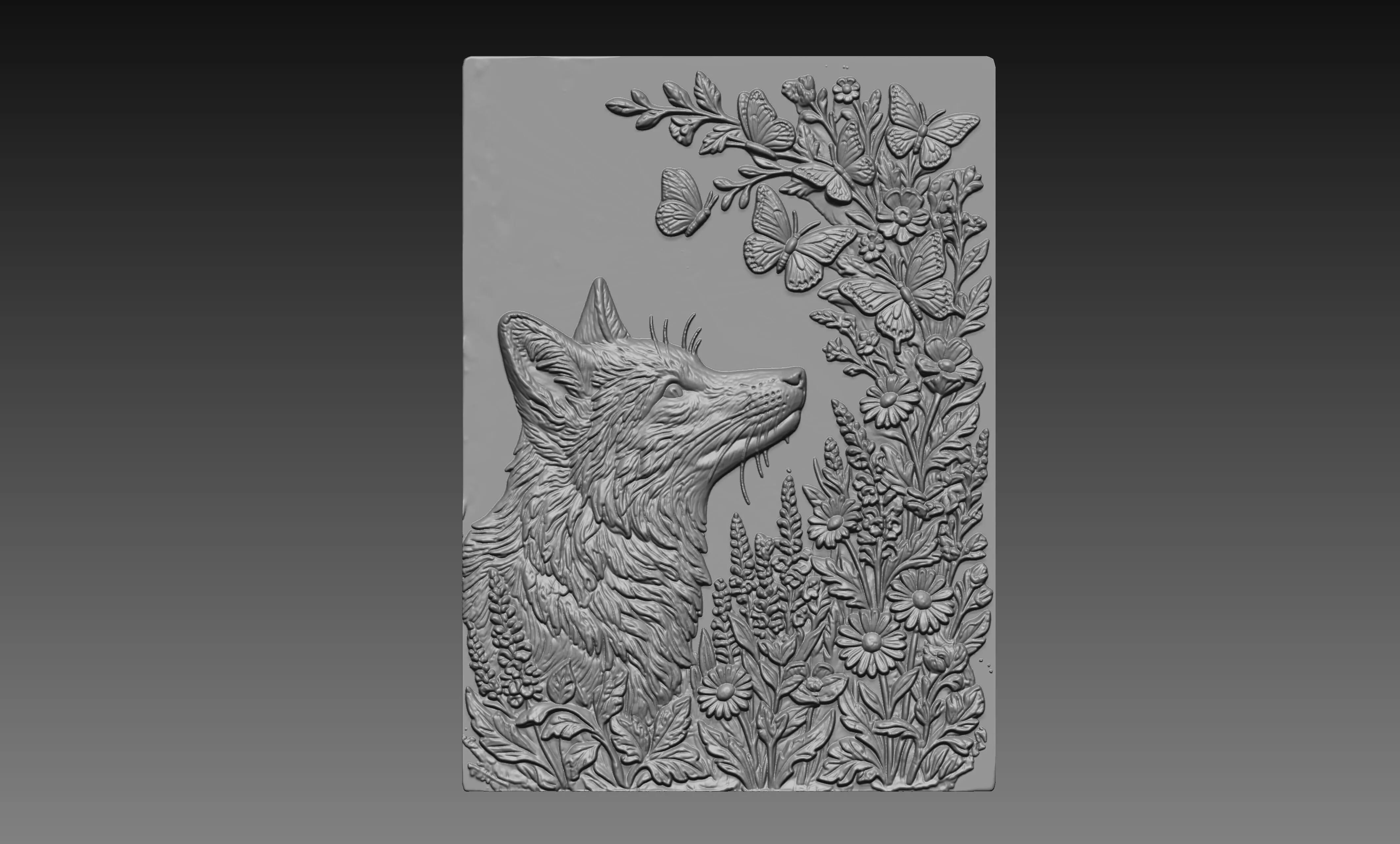 Designed with layered depth and fine detail, this fox relief model highlights gentle expression, flowing fur, and intricate floral and butterfly elements—making it ideal for creating beautiful CNC carvings, wood panels, and 3D printing projects.