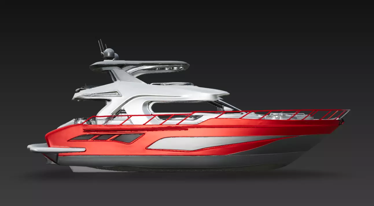 Futuristic Red Sport Yacht with Flybridge is a high-detail luxury motor yacht model featuring an aggressive modern hull design, aerodynamic flybridge structure, and striking red metallic body finish. The sharp side lines, extended front deck, and sculpted rear platform create a powerful and futuristic marine silhouette.