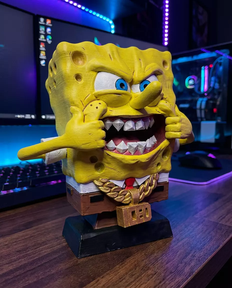Who lives in a pineapple under the sea... and has the coldest chain in the game? This 'Iced Out' SpongeBob bust features the iconic character with a 'ICED' chain and a fierce expression. Peak gaming room vibes for those who love meme culture!