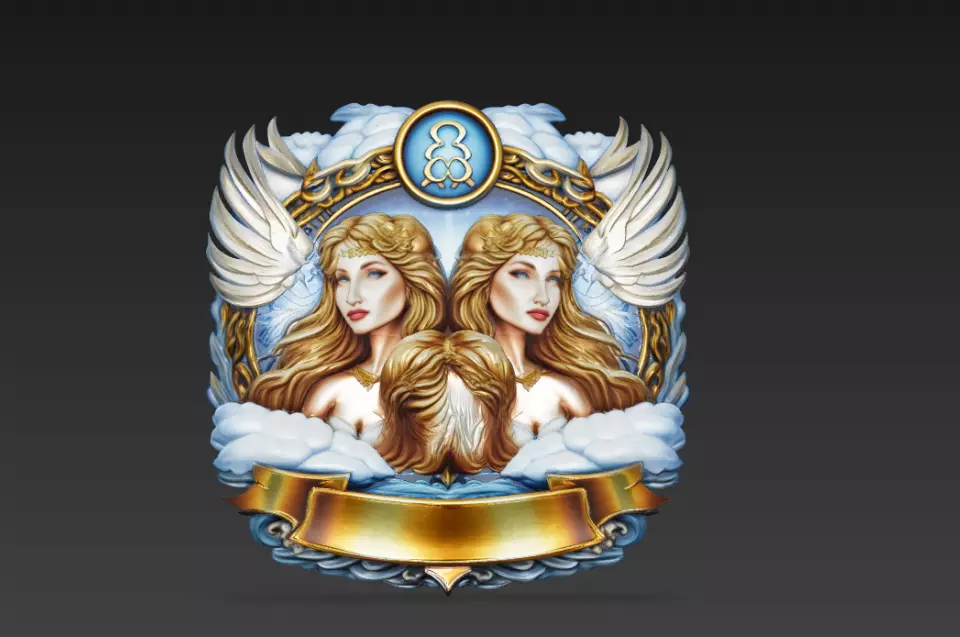 The design blends astrological symbolism with royal insignia aesthetics. The mirrored twin composition, flowing hair sculpting, wing detailing, and the Gemini zodiac symbol positioned at the top create a harmonious and visually refined centerpiece.