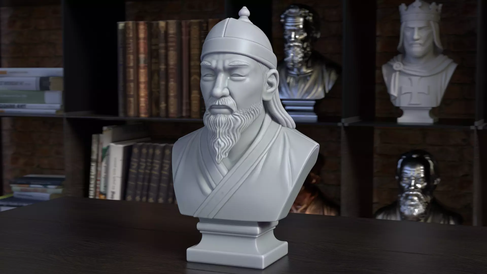 This intricately modeled bust captures the powerful presence of Genghis Khan, the legendary founder of the Mongol Empire. His distinct Mongolian helmet, thick mustache, and intense gaze are sculpted with remarkable detail. The robe’s folds and ornamental clasp emphasize his status and heritage. Perfect for history enthusiasts and collectors alike.