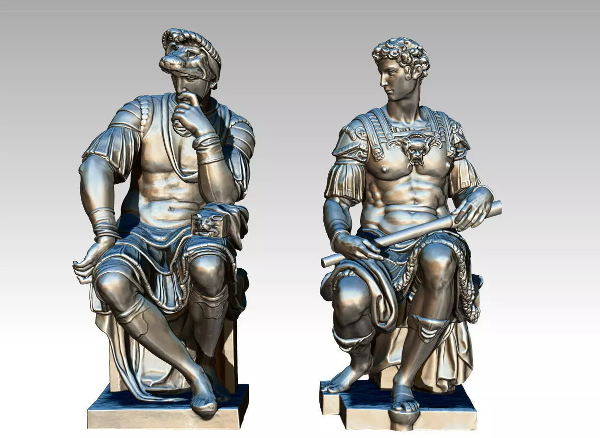 Lorenzo Duke of Urbino and Giuliano de' Medici Duke of Nemours, two masterpieces by MICHELANGELO BUONARROTI, for the first time on the web together in obj and stl formats ready for 3D printingmodels tested and checked in very high resolution also to be machined with 5-axis CNCmodels contain:vertices; 1 333 394faces; 2 666 820