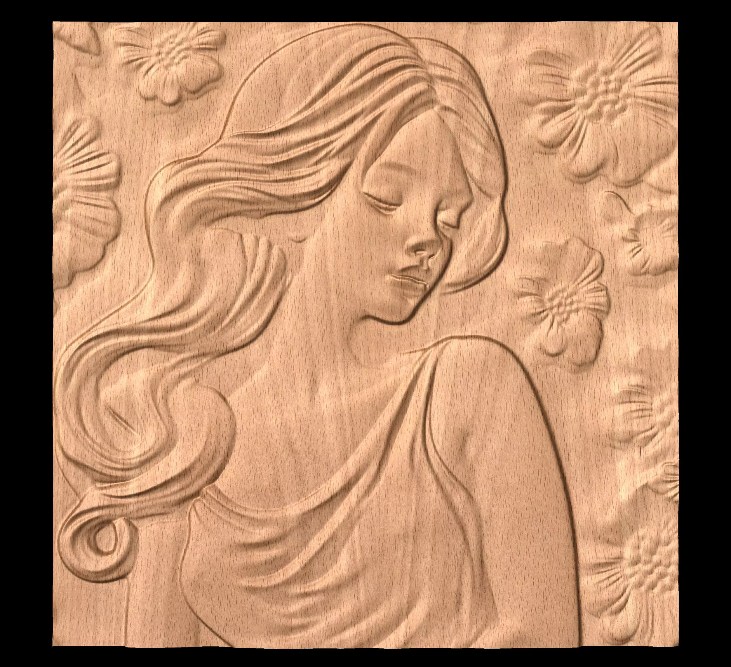 Girl with flowers in background CNC bas-relief 3Dmodel wallart 3D print model