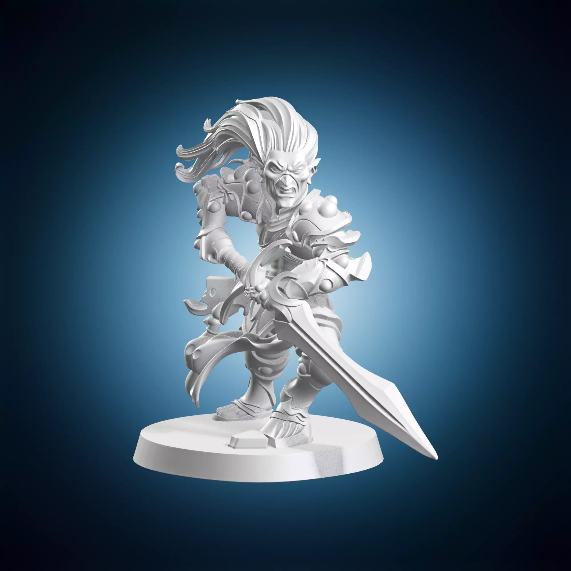 A highly detailed 3D model of a Githyanki champion sword warrior miniature for Dungeons and Dragons enthusiasts. The model is meticulously crafted to showcase intricate details such as textured armor, ornate hilt designs, and precision sculpted facial features. Perfect for collectors and gamers alike, this miniature adds an extra layer of depth to any D&D adventure.