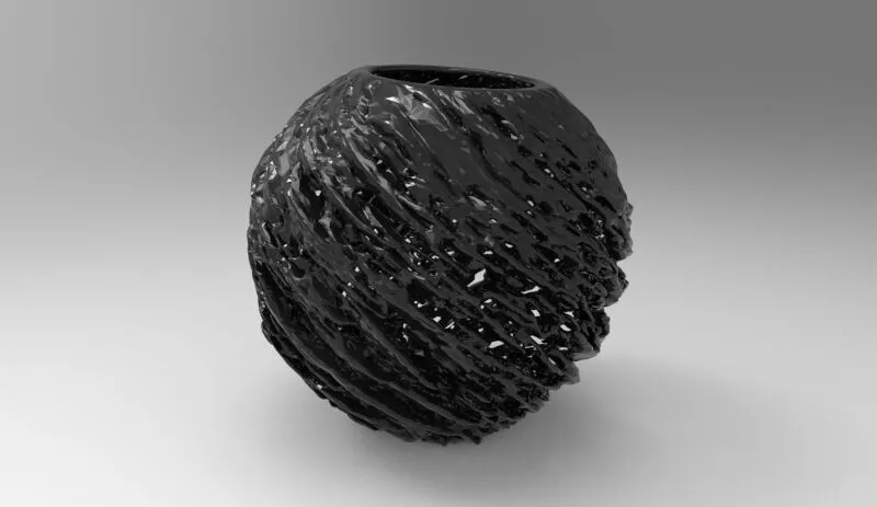 This model features a striking spherical design composed of a complex, porous mesh. The texture resembles liquid obsidian or high-gloss coated wire woven into an organic, asymmetrical pattern. Its reflective black finish creates a fascinating interplay of light and shadow, making it a perfect statement piece for high-end modern interiors, tech-focused architectural visualizations, or avant-garde digital art scenes.