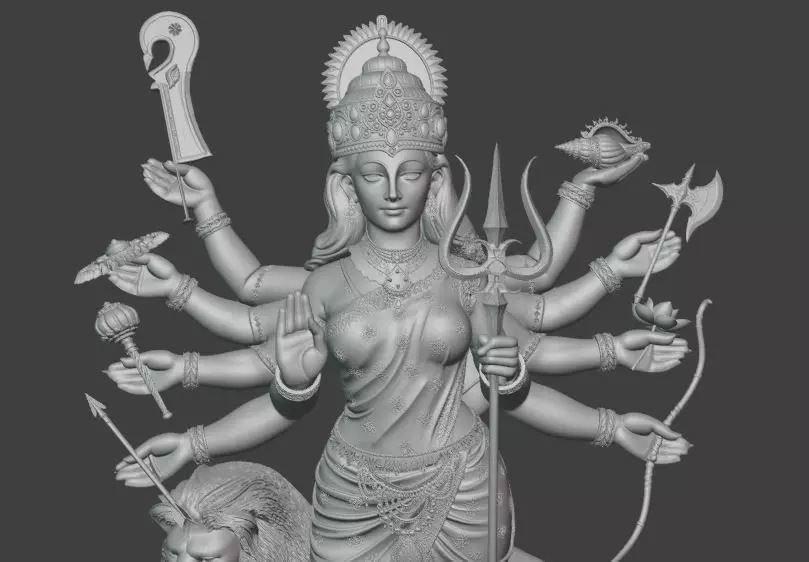 This premium 3D model depicts Goddess Durga in a graceful standing posture with her lion vahana, sculpted with exceptional attention to anatomy, drapery flow, facial serenity, and symbolic detailing. Each hand, ornament, weapon, and garment fold is carefully refined to preserve sharp edges and depth after printing.