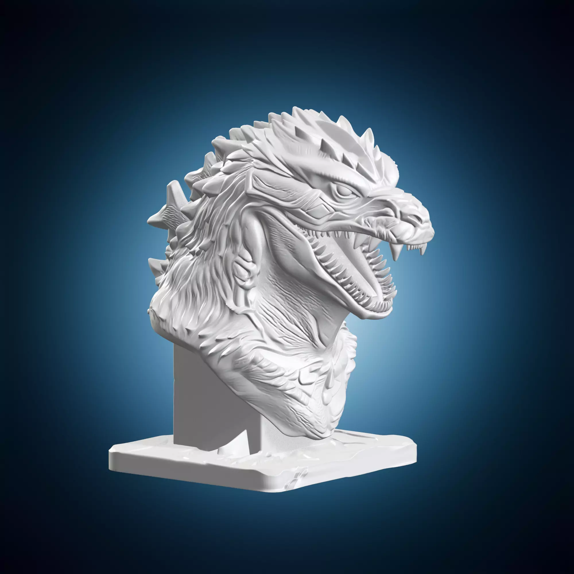 A detailed and impressive 3D model of a Godzilla monster head in a kaiju style statue form, suitable for architectural visualization, product design, and artistic expression. The model is highly detailed with intricate textures and realistic lighting effects. It can be used to create stunning visuals for various industries such as architecture, art, fashion, and more. The 3D model is compatible with most popular 3D modeling software and can be easily edited or modified to suit specific needs.