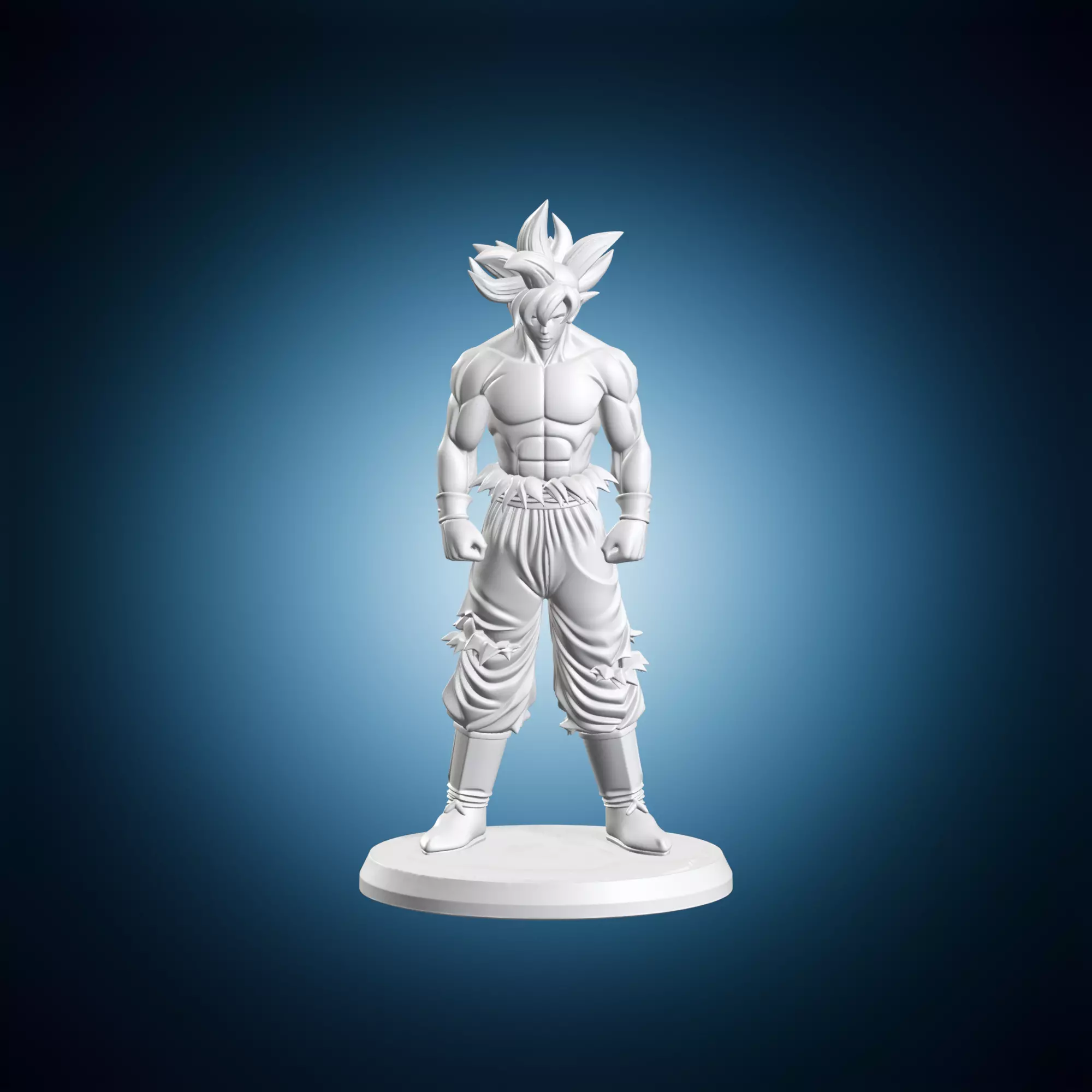 A highly detailed 3D model of Goku in an ultra-instinct state, suitable for use as a statue or for visual effects purposes. The model features intricate textures and poses to capture the character's intense focus. It can be used in various applications, including video games, animations, and live-action productions.
