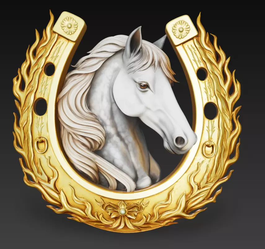 Golden Horseshoe with White Horse Head is a premium decorative 3D wall relief combining elegance, power, and symbolic luck. This sculpt features a graceful white horse head framed inside an ornate golden horseshoe enriched with flowing leaf and flame-inspired details, creating a luxurious and timeless composition.