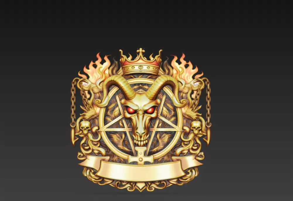 Golden Infernal Goat Crest With Crown And Pentagram features a horned demonic goat skull positioned within a bold pentagram frame, crowned to symbolize dark sovereignty and occult authority. Surrounded by flames, chains, and skull ornaments, the composition blends infernal symbolism with strong heraldic symmetry.