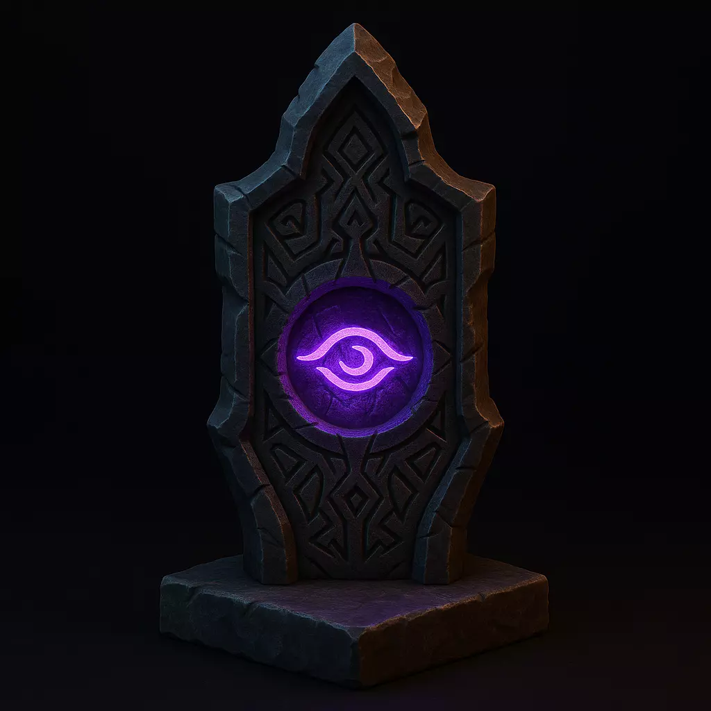 This Gothic Ritual Relic is a stylized arcane stone sculpture featuring intricate carvings and a glowing purple eye symbol at its core. Perfect as a mystical altar piece, magical ward, or arcane artifact in fantasy and dark-themed settings.