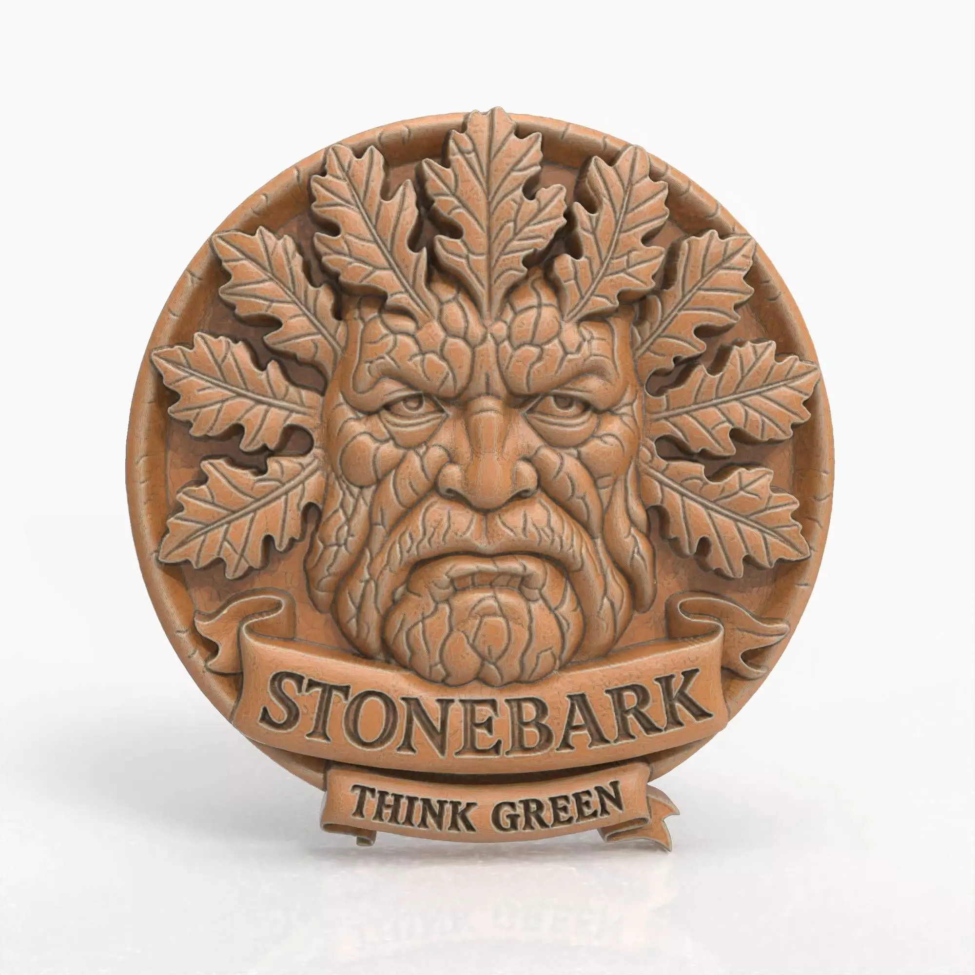This sculpted high-relief Green Man medallion, titled Stonebark, embodies the elemental power of earth. With cracked bark textures, oak leaf framing, and a bold grounded expression, this round carving features a CNC-optimized design and includes a stylized scroll banner. Ideal for woodworking, CNC projects, or fantasy-inspired decor.