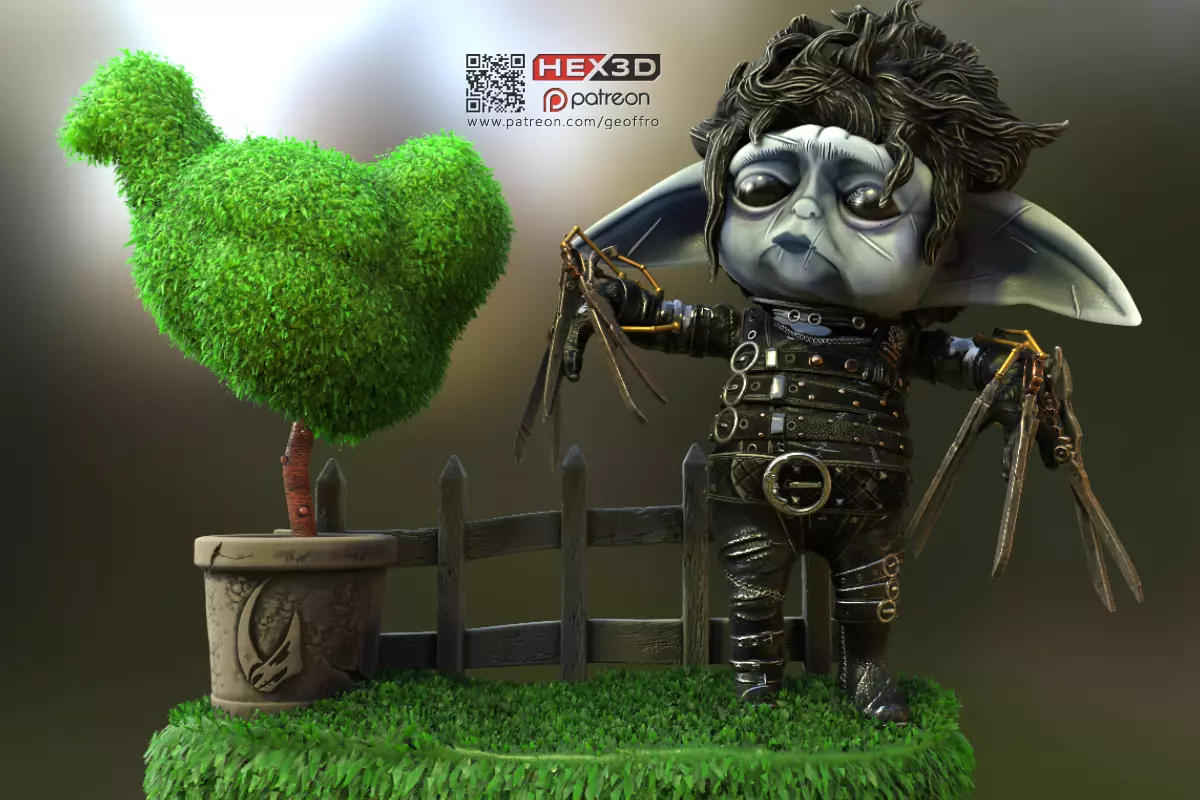 The connectors for the scissors to the wrist are designed to use 1.75mm filament cuts. To create the ball joint look, heat with a lighter until the end forms a small ball and join another small cut of filament while its hot.Suggest strongly flocking grass on the base and the Topiary with hobby grass.