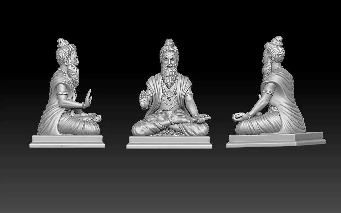 This image showcases a professionally crafted 3D digital sculpture of a Hindu sage or guru, designed with high-fidelity detail for CNC wood carving or 3D printing applications. The model is presented from three comprehensive angles—left profile, front, and right profile—to demonstrate its anatomical accuracy and the intricate textures of the flowing robes and hair. The figure is depicted in a traditional seated Sukhasana posture on a tiered square pedestal, performing the Abhaya Mudra (gesture of fearlessness) with the right hand while holding sacred scriptures in the left. Meticulous details, such as the Rudraksha mala, the distinct top-knot (Jata), and the serene facial expression with a full beard, indicate that this is a high-resolution STL or CAD file optimized for producing physical spiritual idols or decorative relief panels.