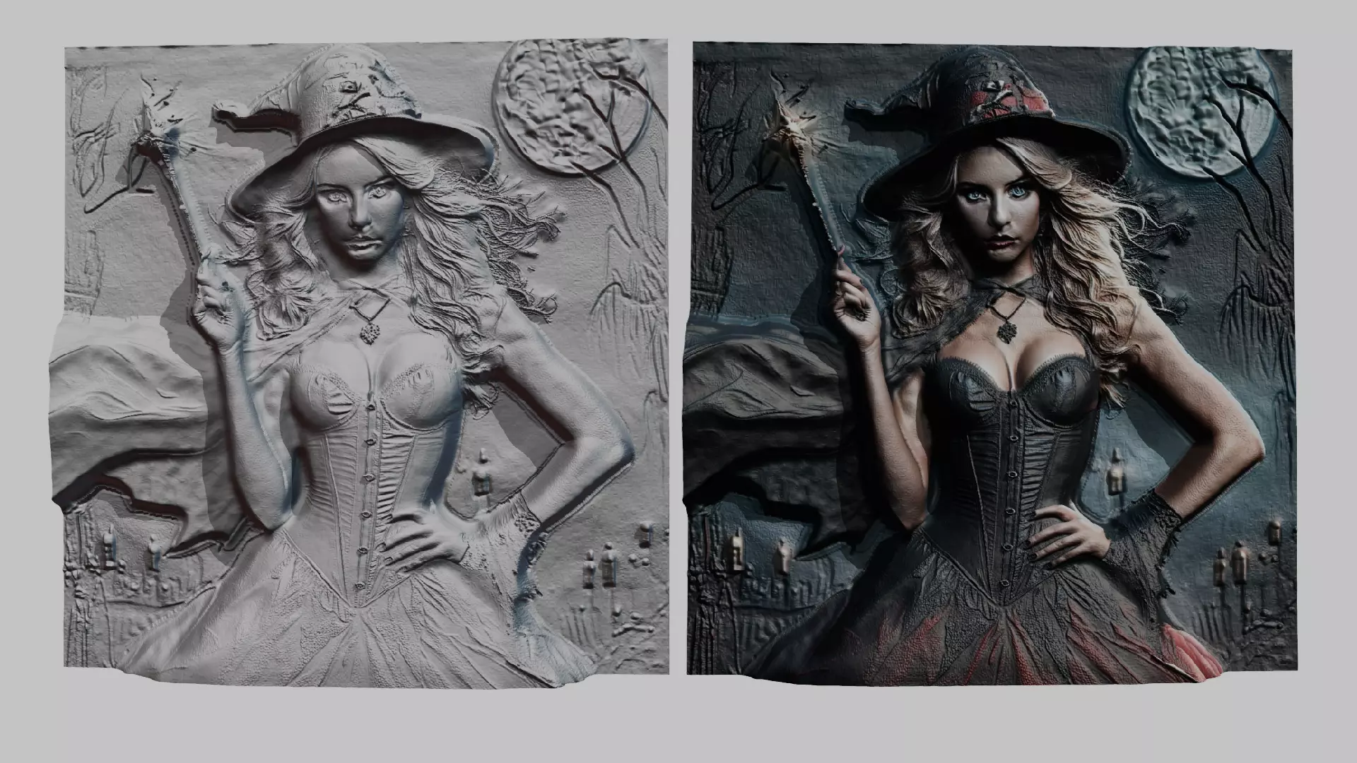 Keywords: Relief Sculpture, 3D Model, ArtCAM, CNC, CNC Router, 3D Printing, Digital Art, Decorative, Wall Decor, Wood Carving, Engraving, Landscape Model, Portrait Sculpture, Halloween, witch, Halloween girl, Halloween costume, Halloween outfit, pumpkin