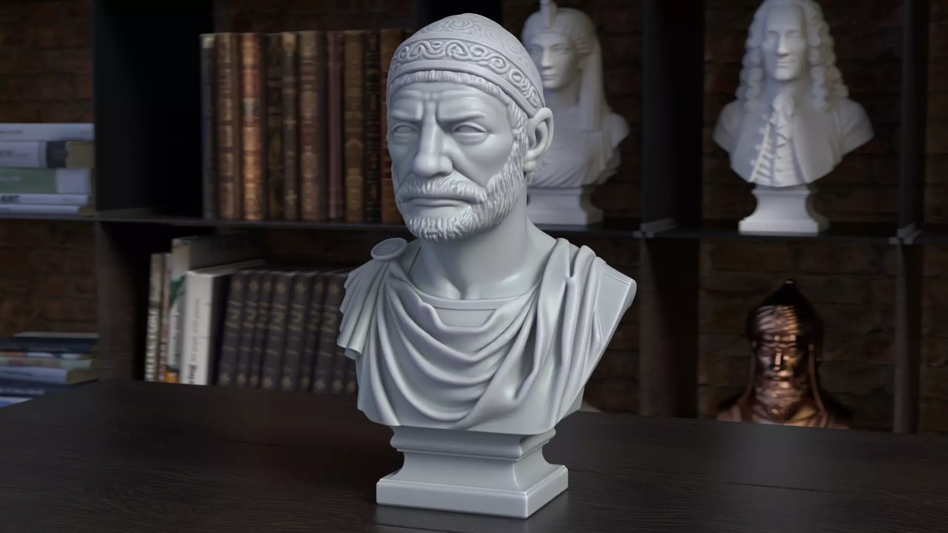 This bust captures the likeness of Hannibal Barca, the legendary Carthaginian general known for crossing the Alps during the Second Punic War. The sculpture showcases his distinctive helmet, short-cropped beard, and commanding expression. It features a draped military cloak and sturdy Roman-style base, ideal for collectors and historical model enthusiasts.