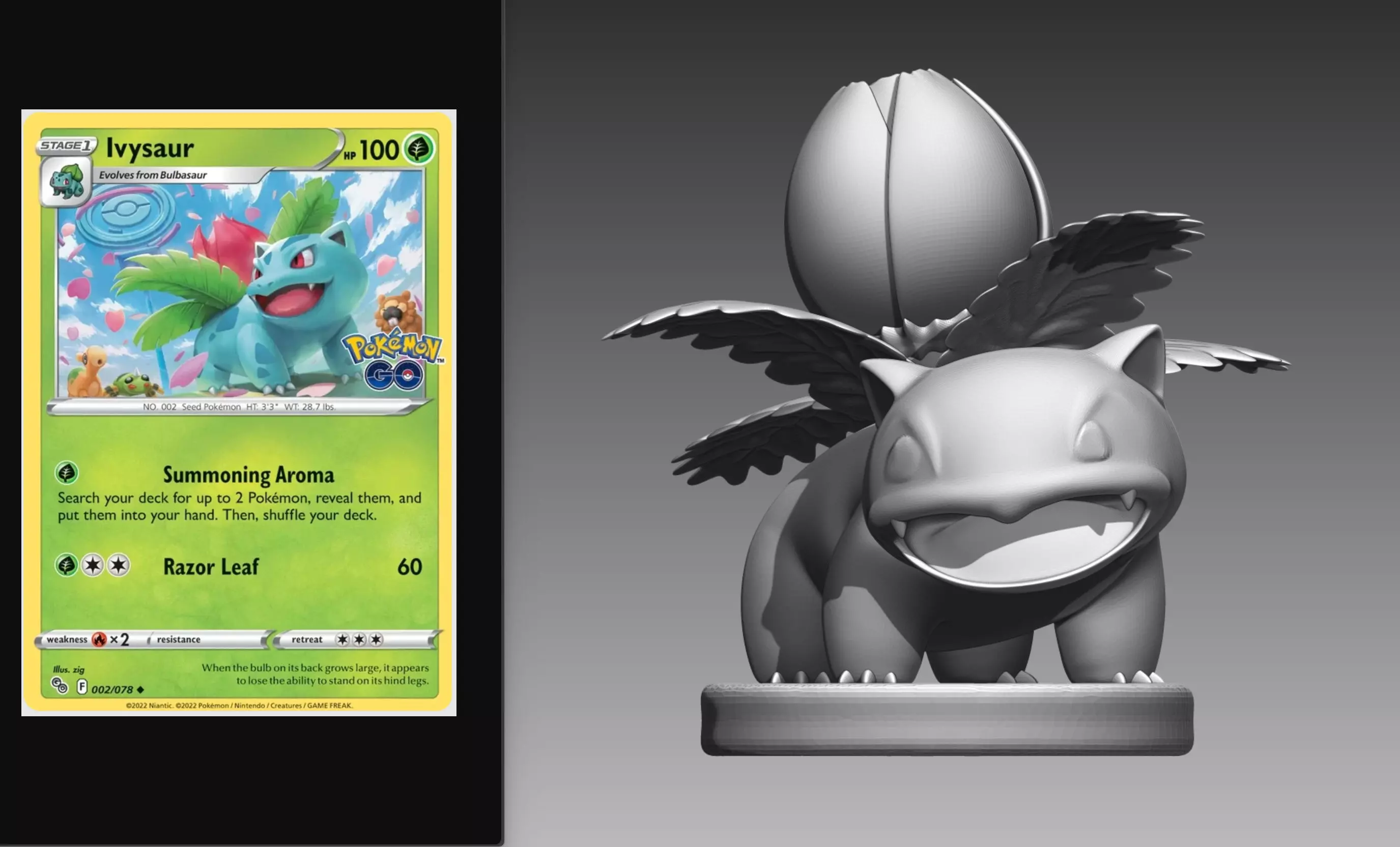 Ivysaur is a quadrupedal amphibian Pokémon that has blue-green skin with darker patches. On top of its head are pointed ears with black insides and it has narrow red eyes. Ivysaur has a short, rounded snout with a wide mouth and two pointed teeth in its upper jaw. Each of its feet has three claws on them. The bulb on its back has bloomed into a large pink bud. A short brown trunk surrounded by leafy green fronds supports the bud.