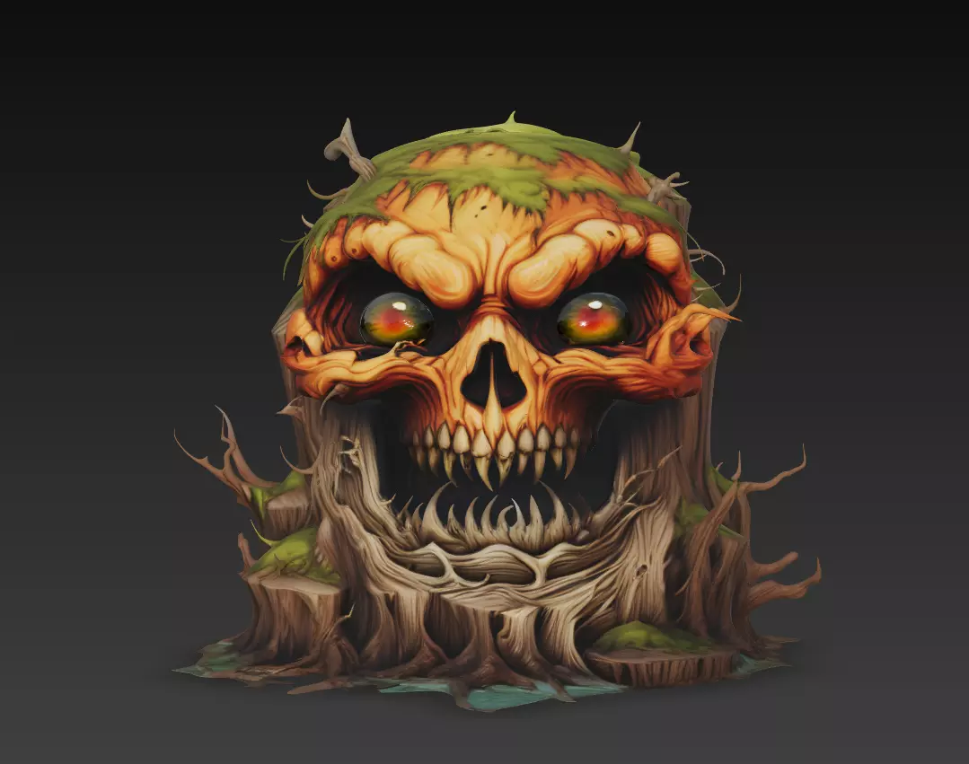 A terrifying fusion of decayed wood and skull anatomy, this model embodies the spirit of haunted forests and ancient curses.The Haunted Treerot Skull design features a grotesque pumpkin-like cranium embedded within rotting bark, covered in moss and twisted roots — perfectly suited for Halloween environments and dark fantasy renders.Crafted for both CGI scene integration and 3D printing collectors seeking atmospheric horror sculptures.