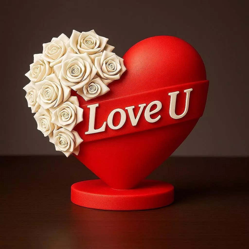 This heart-shaped sculpture captures a timeless romantic theme through smooth contours and carefully balanced decorative elements. The glossy heart form is wrapped with a flowing ribbon that gently frames the central inscription, while a cluster of sculpted roses adds softness and visual contrast to the composition. The rounded base completes the design, giving the piece a stable and ornamental presence.