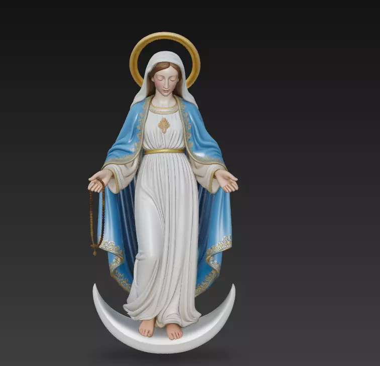 This beautifully crafted 3D model depicts the Virgin Mary standing gracefully on a crescent moon, symbolizing purity, protection, and divine presence. Featuring flowing robes, a delicate rosary, a golden halo, and soft expression, this sculpture is ideal for religious art, decor, statues, CNC carving, and high-quality 3D printing.