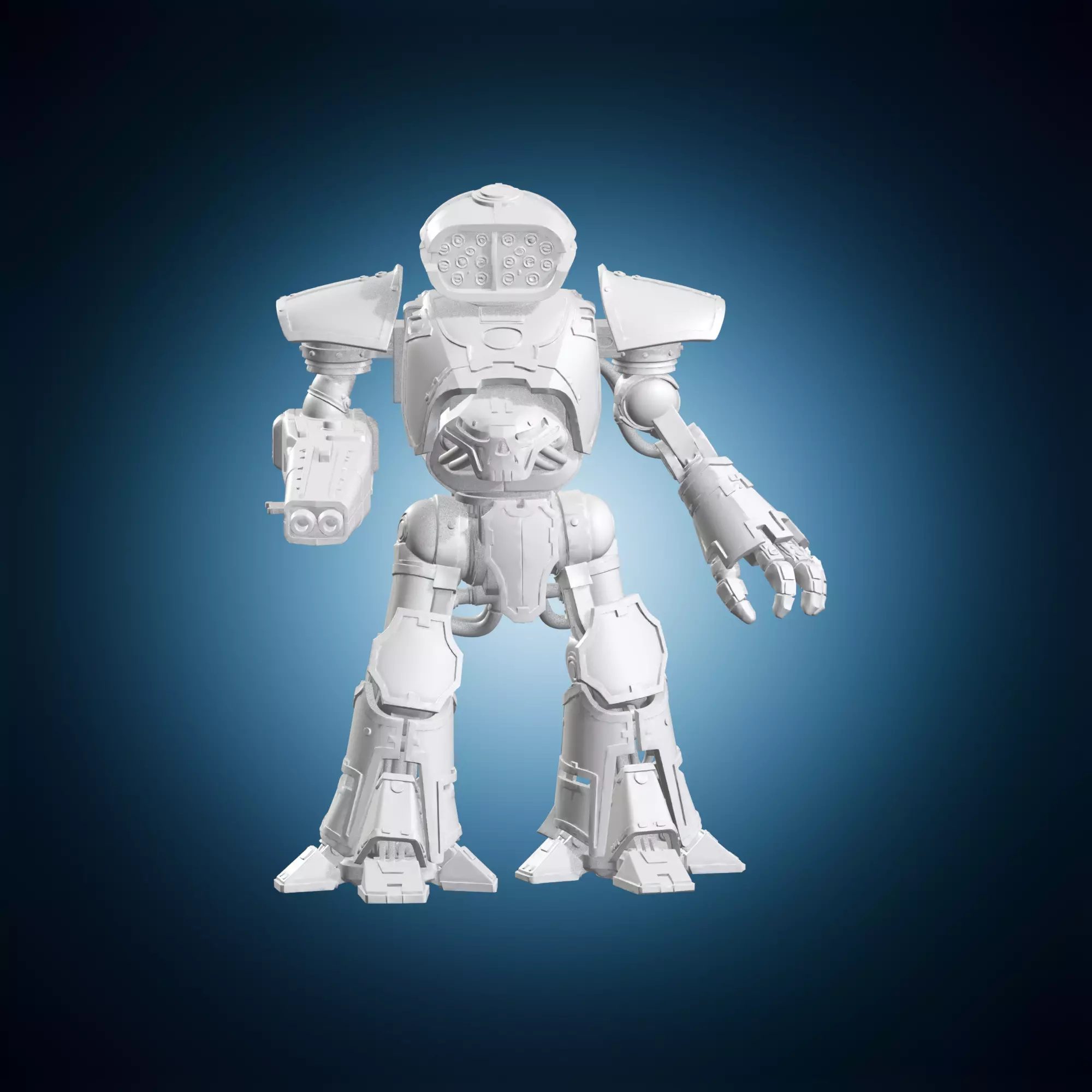 A detailed 3D model of a heavy battle mech miniature, featuring a skull-like face. This miniature is designed to be used as a decorative piece or for use in scale modeling projects. It can be customized and modified using various tools and software. The model is created in multiple formats including STL and OBJ, making it easily importable into 3D printing or modeling software.