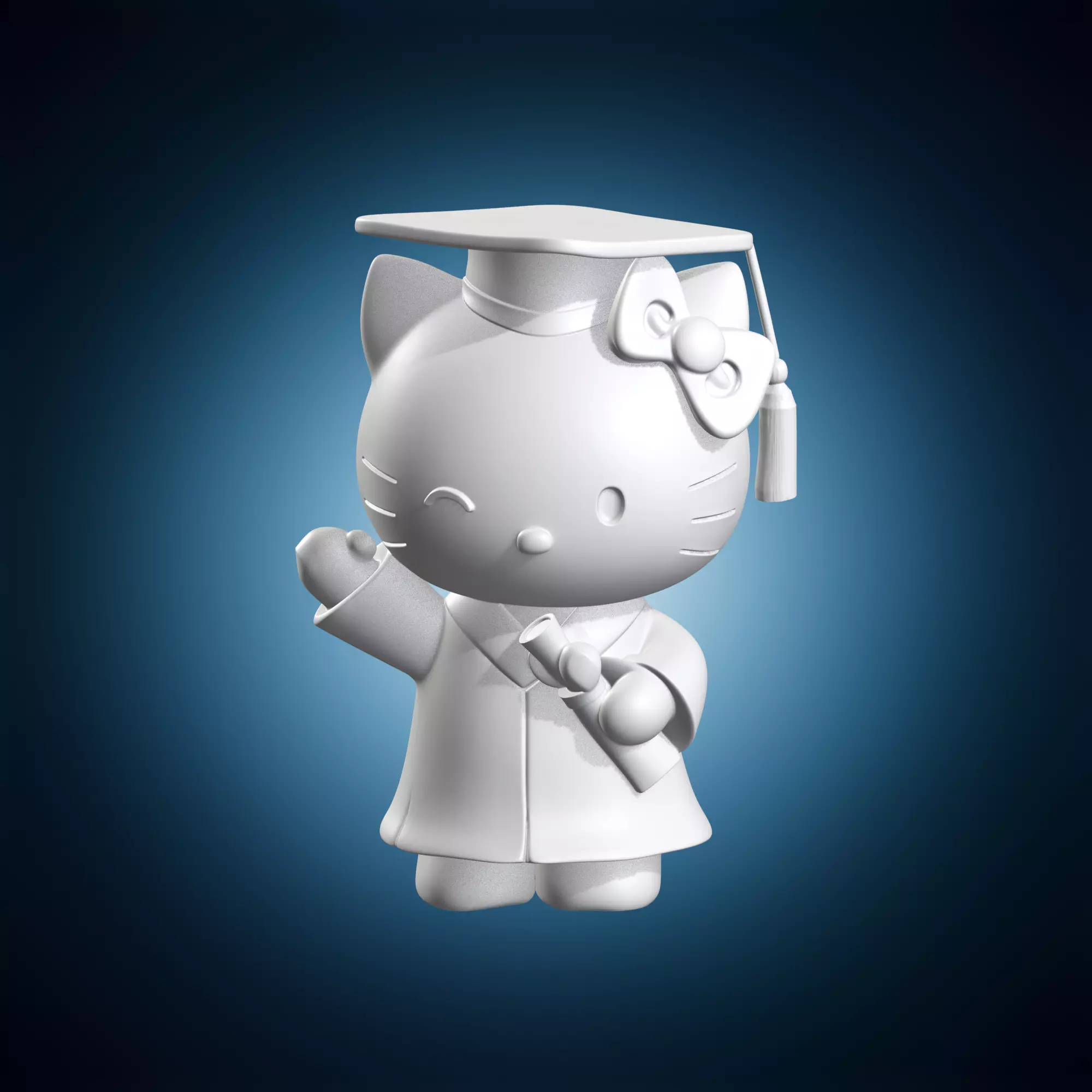 A miniature figurine of Hello Kitty wearing a graduation cap and gown. This adorable character is perfect for fans of Japanese pop culture. The model is designed to resemble the beloved cartoon character, with intricate details and realistic textures. It can be used as a decorative item or collectible figure. Suitable for display on shelves or in collectible displays.