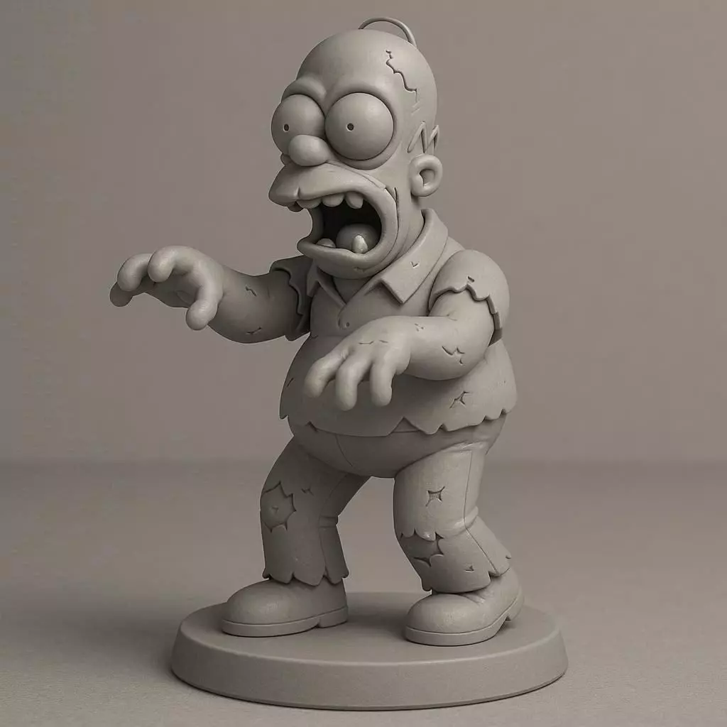 3D printable model of a stylized Homer Simpson, reimagined as a zombie, standing on a round display base. The figure features exaggerated cartoon proportions — large round head, bulging eyes, open mouth with missing teeth, and torn clothing revealing simplified zombie details like cracks and stylized wounds. His pose is slightly hunched with arms stretched forward in a classic zombie stance. Smooth, reinforced geometry optimized for reliable 3D printing, with strong connections between figure and base for durability. Compact, sturdy design suitable for Halloween decoration or collectible display. Neutral studio lighting, white background.