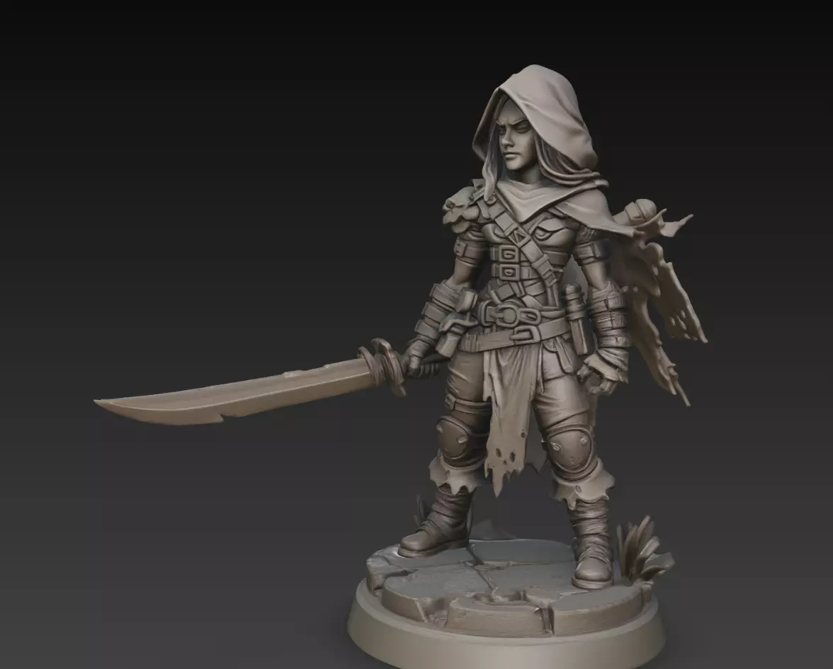 Hooded Female Warrior Sword Rogue Knight is a highly detailed fantasy character designed with a balance of stealth, strength, and elegance.