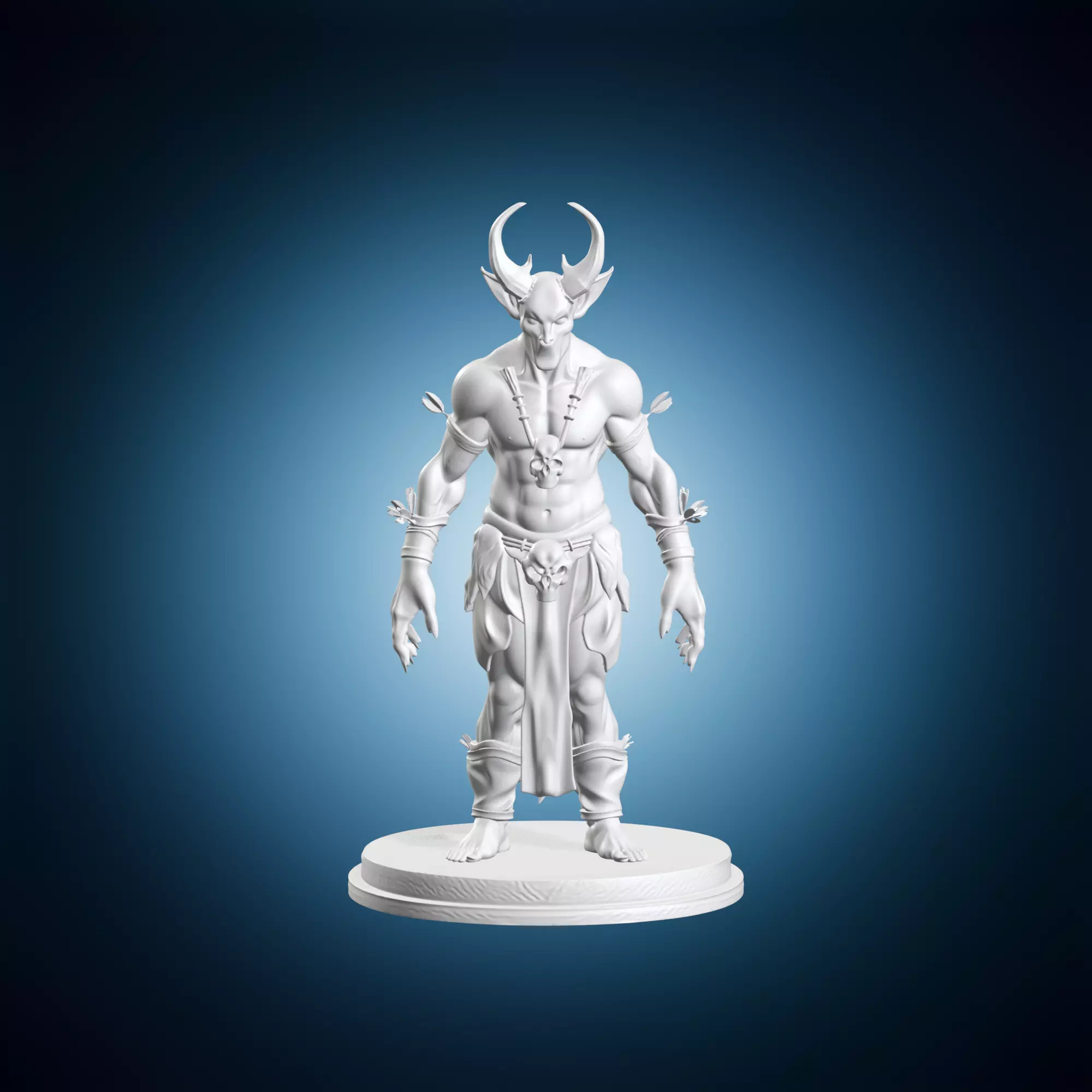A fantasy miniature sculpture of a horned demon warrior with tribal skull adornments. The model depicts a powerful and intimidating figure with intricate details and textures. The horned demon warrior is dressed in traditional tribal attire, complete with ornate headpieces and facial markings. The overall design is reminiscent of ancient mythologies and folklore. This 3D model is perfect for fantasy artists, sculptors, and collectors looking to add a unique piece to their collection.
