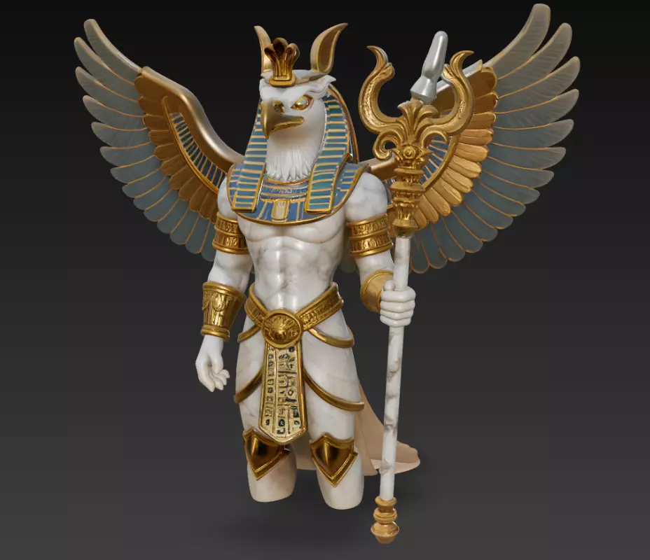 This Horus the Sun Falcon 3D Model represents the Egyptian god of the sky and light, symbolizing protection, divine vision, and royal strength.Depicted with majestic wings, marble textures, golden ornaments, and a ceremonial staff, this piece embodies both historical reverence and modern artistry.