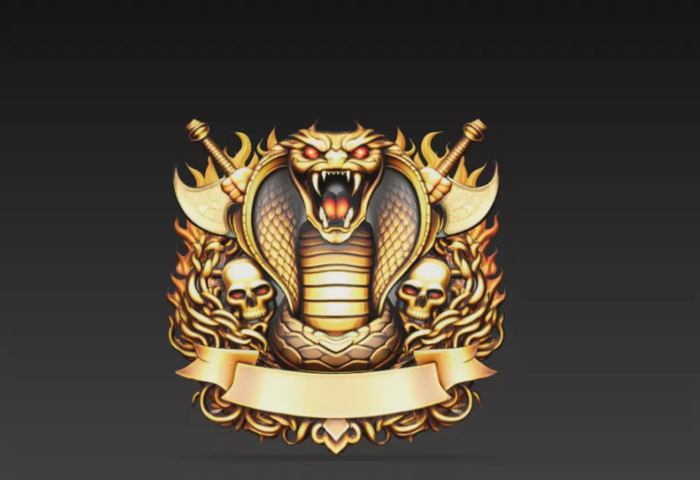 Infernal Cobra War Crest with Flaming Axes 3D Model features a fierce cobra with expanded hood, surrounded by flames, crossed battle axes, skull ornaments, and heavy chain elements arranged in a symmetrical heraldic composition.