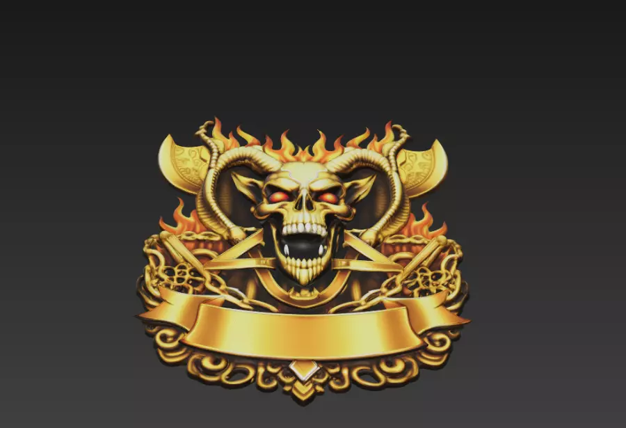 This Infernal Demon Skull Crest 3D Model features a menacing horned skull centerpiece surrounded by ornate gothic elements, blazing flames, crossed weapons, and intricate ornamental detailing.