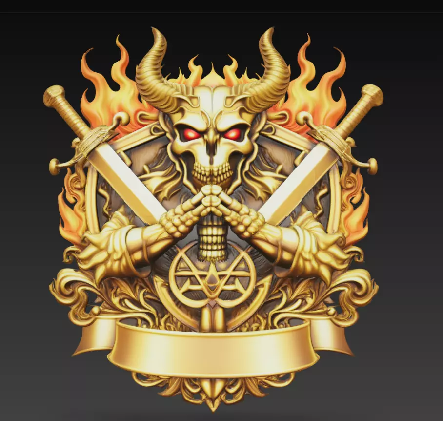 Infernal Horned Skull Crest With Swords and Sigil is a dark fantasy emblem featuring a horned skull with glowing eyes, crossed swords, ritual hand pose, and an occult sigil centerpiece. Surrounded by flames and baroque ornamental frames, the composition radiates infernal power, dominance, and forbidden symbolism.