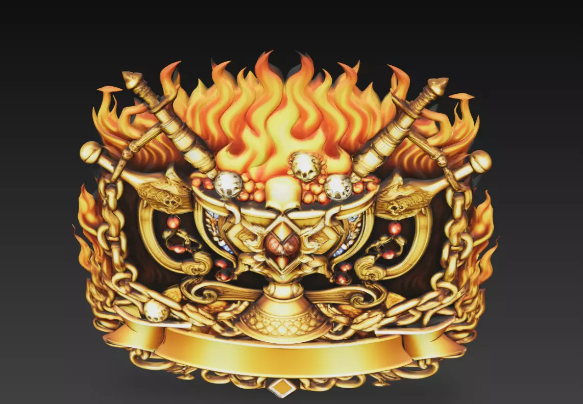 This Infernal Ritual Chalice Crest 3D Model features a demonic ceremonial goblet adorned with skull details, flaming elements, crossed swords, heavy chains, and intricate gothic ornamentation.