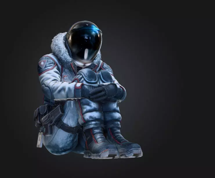 This is a highly detailed cinematic astronaut character model designed for real-time rendering, animation, and collectible visualization projects. The model features a seated pose with carefully sculpted fabric folds, tactical suit detailing, helmet reflections, and realistic surface textures.