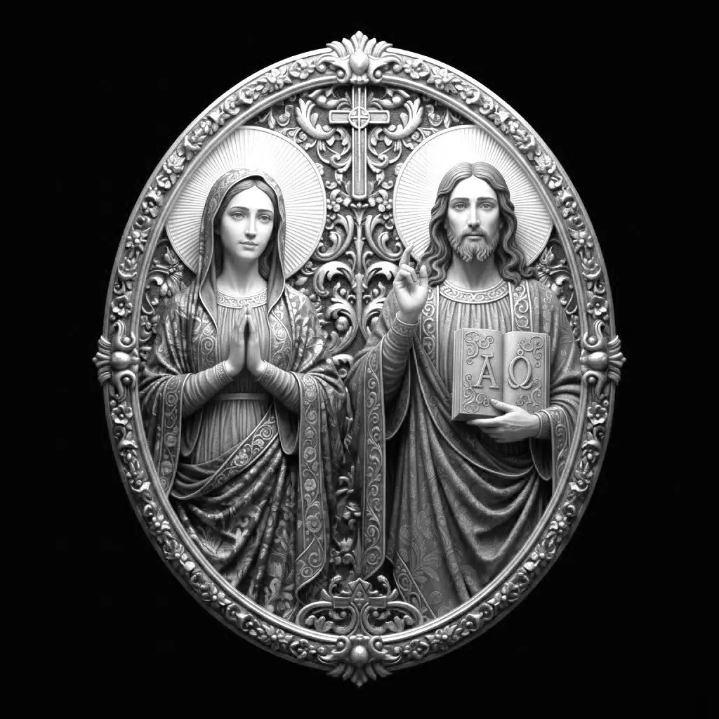 Premium Quality:Expertly crafted with masterful attention to Byzantine iconography, facial expressions, fabric draping with intricate patterns, Alpha Omega lettering, ornamental frame details, halo radiating rays, and sacred symbolism. Professional-grade digital sculpture suitable for fine religious art reproduction and worship spaces.