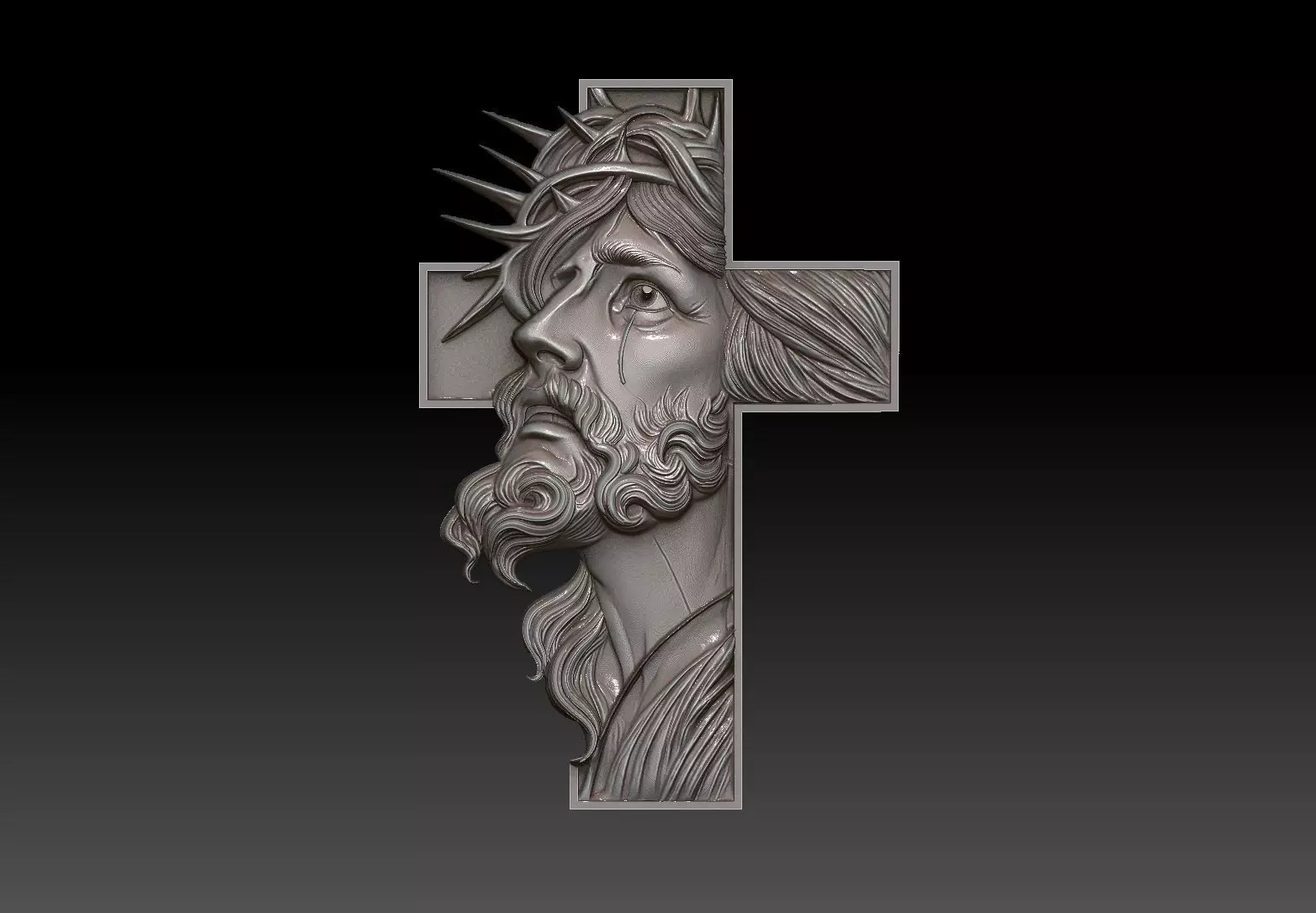 This STL 3D model depicts Jesus Christ in profile wearing the crown of thorns, integrated into the form of a cross. With fine detailing in the hair, beard, and expression, this relief is designed for CNC carving, 3D printing, and engraving. Ideal for creating religious wall art, plaques, or devotional items.