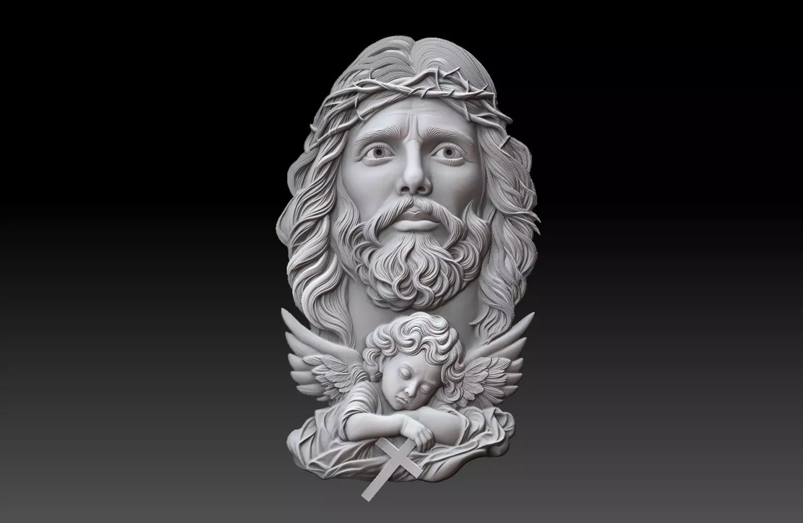 A detailed bas-relief 3D sculpture depicting the face of Jesus crowned with thorns, accompanied by a sleeping angel holding a cross. This artwork captures a moment of serenity and divine compassion, ideal for religious art, jewelry, or decorative engraving.The model features fine sculptural detailing — expressive facial anatomy, realistic hair flow, and smooth transitions suitable for CNC machining or high-resolution 3D printing.