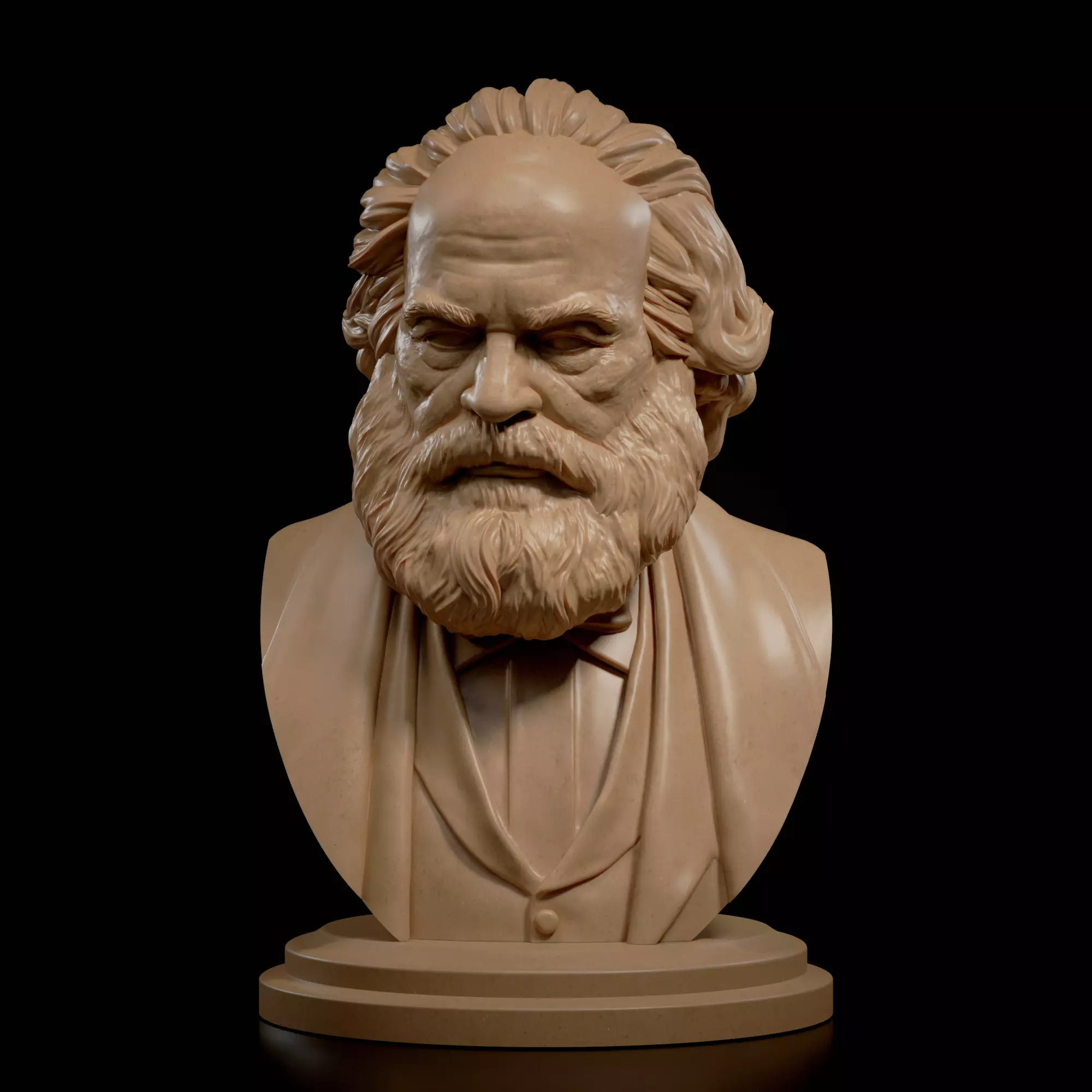 This is a bust of Karl Marx, the German philosopher. The deeply carved lines of his forehead, the cascading fullness of his beard, and the heavy drape of his garments all work together to suggest not only a man, but the immensity of his ideas. His downward gaze carries an introspective stillness, as though turned inward toward visions of history, struggle, and possibility.