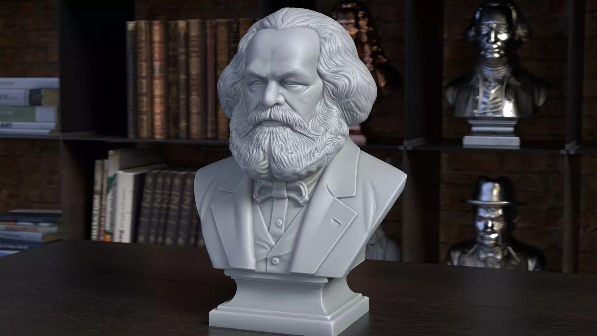 Highly detailed bust of Karl Marx, based on historical portraits and sculptural references, featuring his iconic full beard, receding hairline and intense gaze. The model includes a classic 19th-century suit with lapels and bow tie, seated on a clean, museum-style pedestal for easy display. Ideal as a centerpiece for political philosophy enthusiasts, educational environments or collectors of historical figures, this bust is optimized for 3D printing with crisp facial details and smooth surfaces for post-processing and painting.