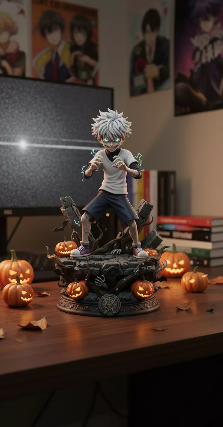 Fan art statue capturing Killua Zoldyck from Hunter × Hunter in a chilling Halloween setting. Killua stands poised for action, his spiky white hair and mischievous grin reflecting his elite assassin heritage. His ice-blue eyes glow with eerie intensity, hinting at the deadly power he commands. The multi-layered diorama base features twisted tree roots, crumbling tombstones, and swarms of bats, all illuminated by several glowing jack-o’-lanterns that cast dramatic shadows. Sculpted cracks in the stone floor and skeletal hands emerging from the ground add extra creepiness and detail. Perfect for anime collectors and 3D-printing enthusiasts, this STL model combines dynamic character design with a spooky horror atmosphere. Unofficial fan art, not affiliated with the original rights holders.