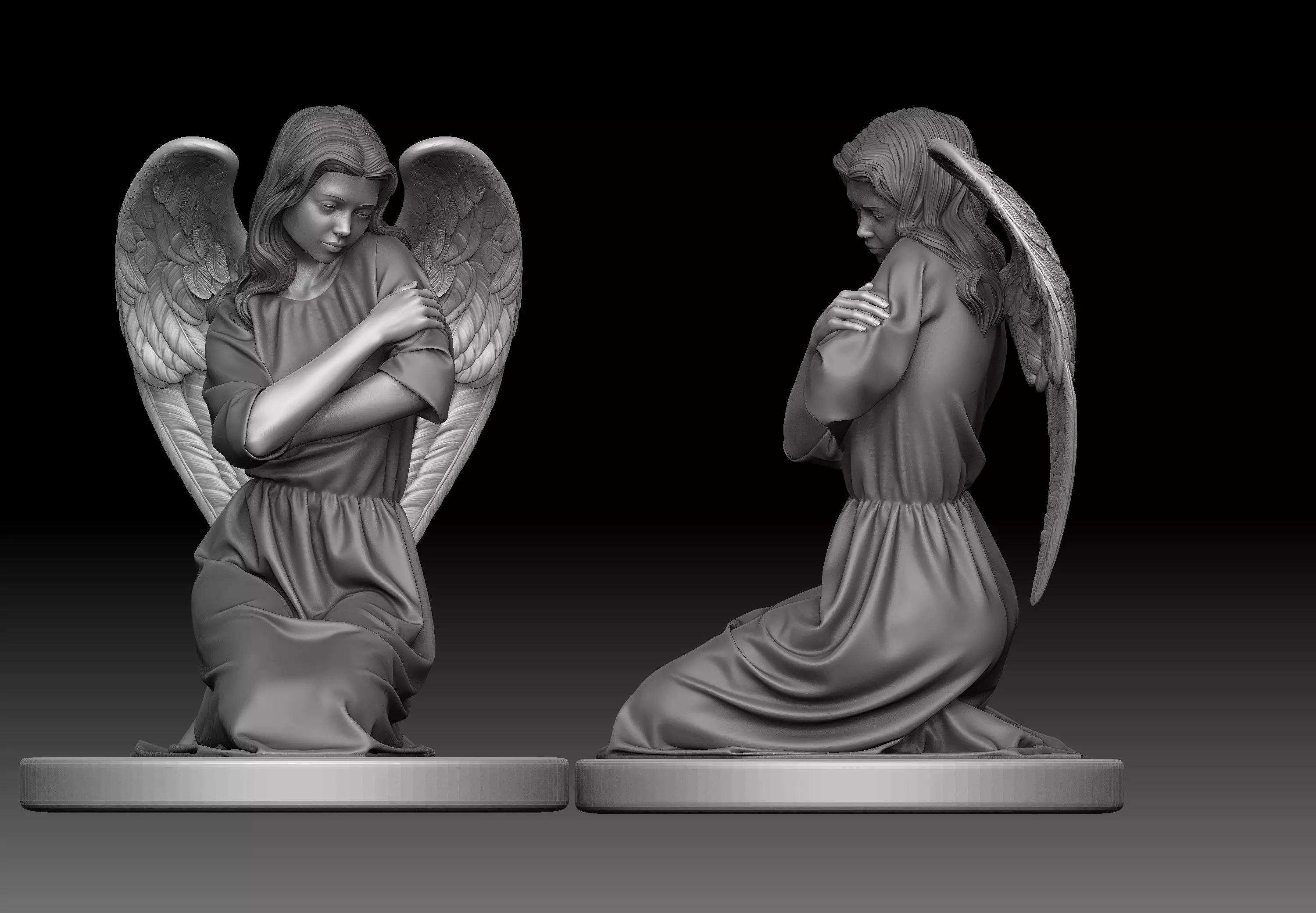 This high-quality STL 3D model depicts a graceful kneeling angel with finely sculpted details, flowing dress folds, and realistic feathered wings. The model captures a serene and peaceful expression, perfect for religious art, decorative sculptures, or commemorative projects.