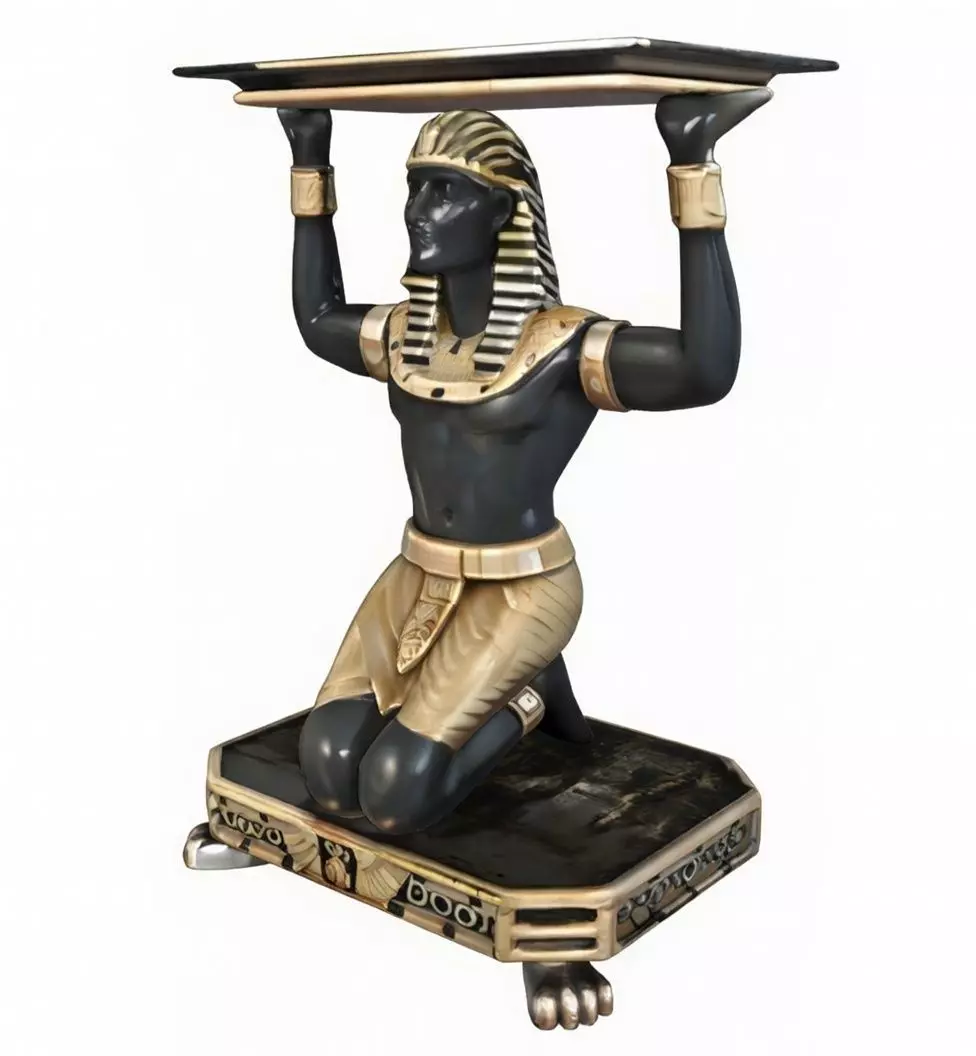 Elevate your interior decor or 3D printing projects with this stunning Kneeling Egyptian Pharaoh Statue Side Table 3D Model. Inspired by ancient Egyptian art, this majestic pharaoh figure in a traditional kneeling pose supports a sleek rectangular top tray, perfect as a functional side table, display stand, or luxurious decorative sculpture.Crafted with intricate details including the iconic nemes headdress, broad collar, golden armbands, and hieroglyphic-embellished base featuring Egyptian motifs like scarabs, eyes of Horus, and symbolic elements. The model combines black obsidian-like body with rich gold accents for an authentic pharaonic luxury look.Ideal for: