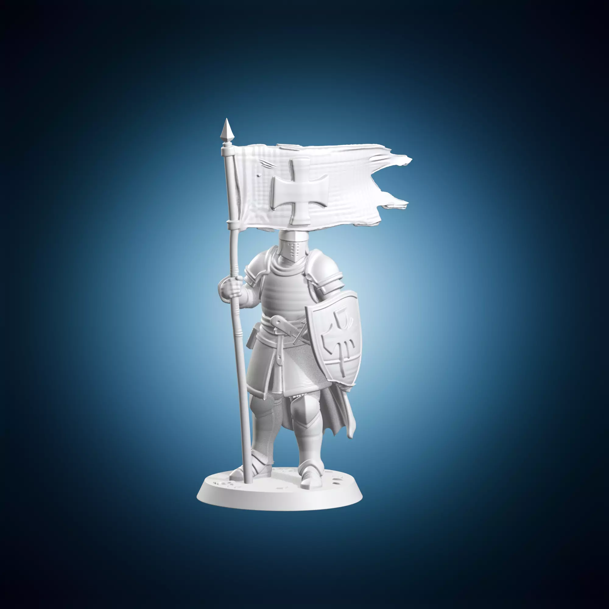 A detailed representation of a knight miniature in standard bearer banner with shield, suitable for art and collectible purposes. The model showcases the intricate details of medieval armor and equipment. It can be used as a decorative piece or reference material for artists and historians. The size and scale of the model are ideal for display on shelves or in dioramas. The standard bearer banner adds an element of drama and grandeur to the scene, while the shield provides protection and symbolism. Overall, this miniature is a testament to the skill and craftsmanship of medieval artisans.