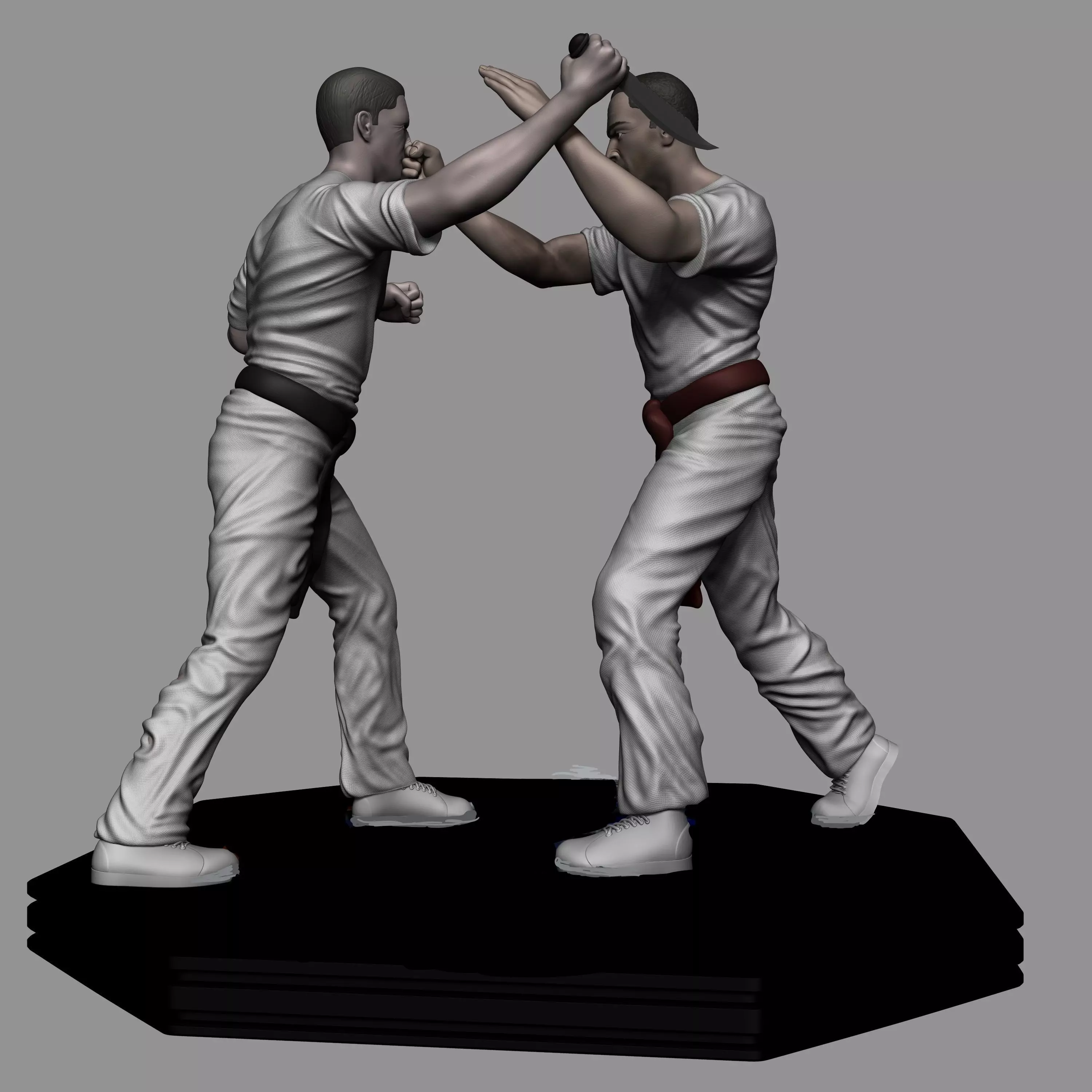 Nice model. Using it for a display at our dojo. I noticed something, the two people fighting are wearing karate belts which Krav does not wear/use.
