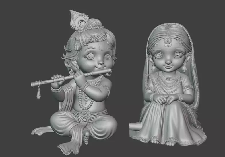 This Model is Updated with Ornaments has been added for more details This adorable 3D model of Bal Krishna and Radha captures divine childhood innocence, featuring Krishna playing the flute while Radha sits beside him in a graceful pose. With intricate detailing on attire, ornaments, and expressions, this model is perfect for resin or FDM 3D printing. Ideal for temple décor, festival celebration, home altar, or collectible displays.