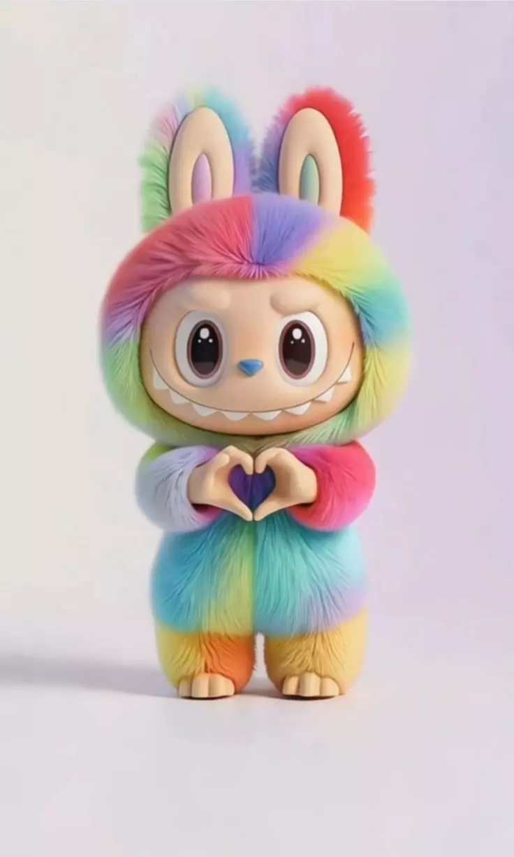 Adorable Labubu-style chibi monster bunny 3D model featuring a fluffy costume, big expressive eyes, and a playful heart hand pose. Perfect as a collectible figurine, resin print, or gift for fans of cute characters and fanart toys. The heart-shaped hands make this model extra special for decoration, gifting, or painting.