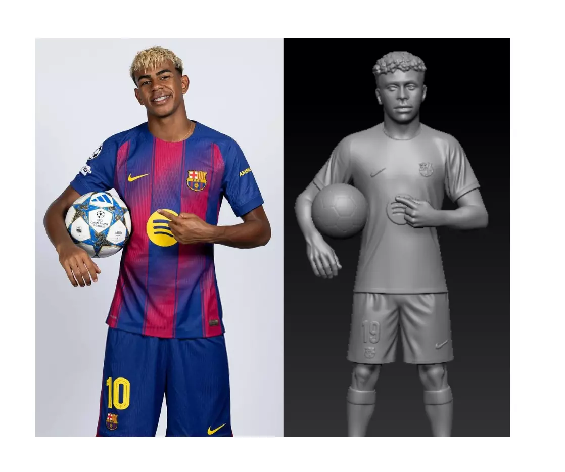 This piece captures Lamine Yamal, one of Barcelona’s brightest young stars, in a confident pose holding the ball and pointing towards the club emblem. The design reflects both his rising status in the football world and his connection to FC Barcelona. His detailed kit, realistic stance, and subtle facial expression make this work a tribute to his growing career and impact in the game. Created to highlight his role as a promising talent in modern football, it emphasizes both the individuality of the player and the pride of wearing Barcelona colors.Format: Digital design